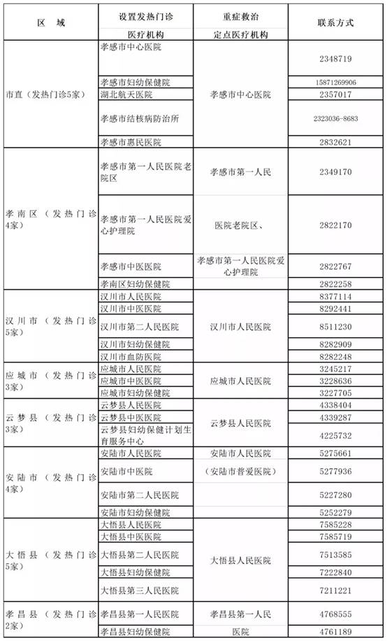 一、全市发热门诊共31家,其中:孝感市直5家,孝南区4家,其他县市22家。