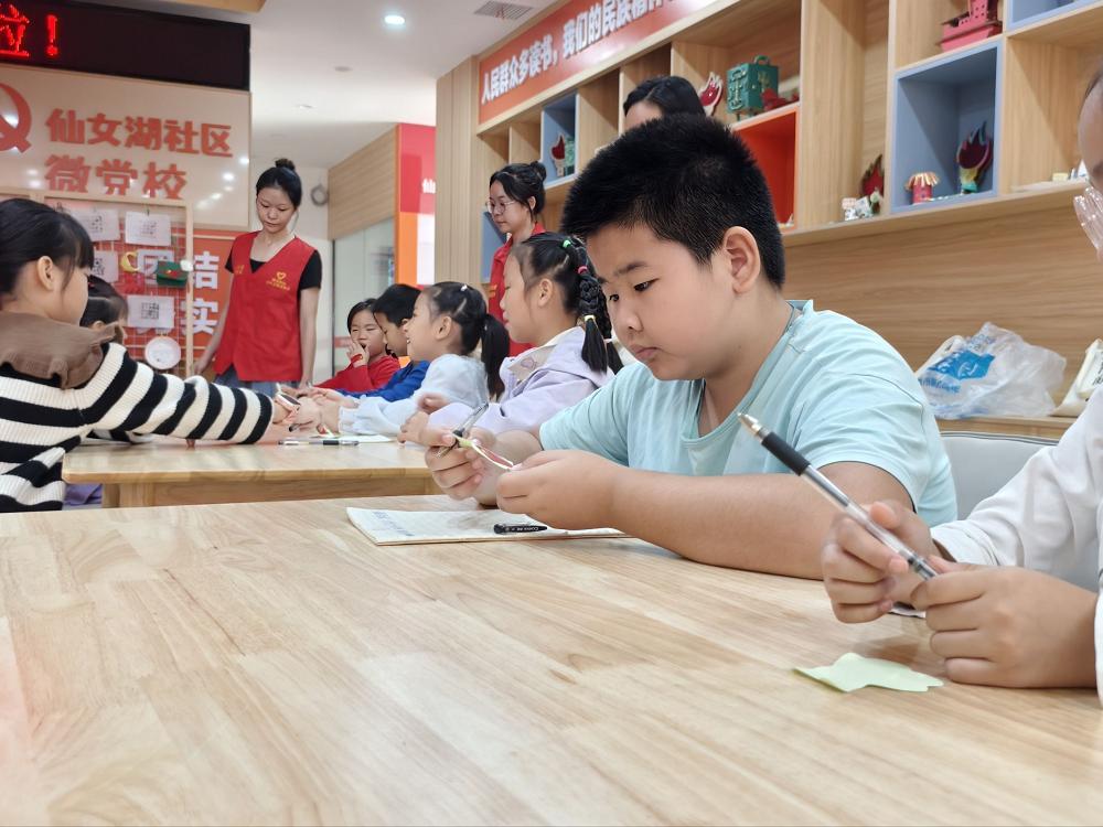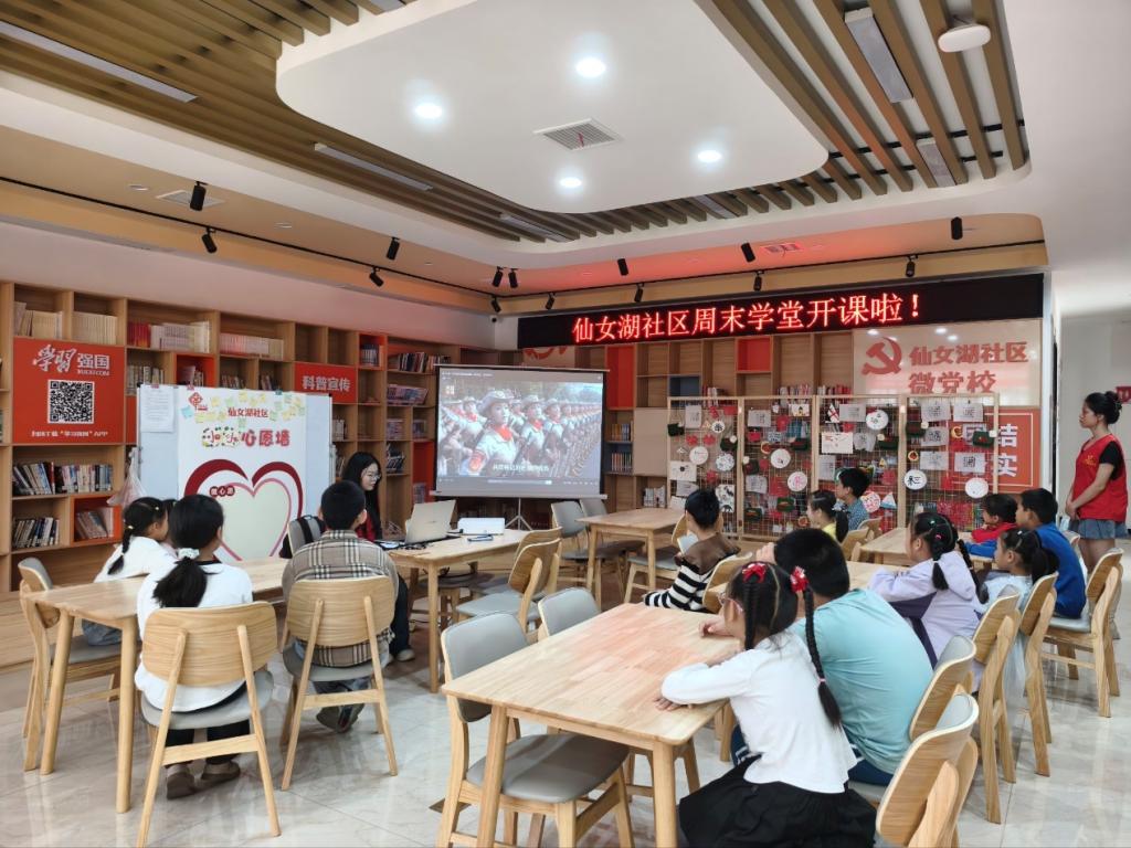 “周末课堂”正式开启后,首个环节围绕爱国教育展开。志愿者主讲人提前准备了生动的影像资料,与小朋友们一同重温“9·3”阅兵的雄伟场面——整齐的方阵、先进的装备、昂扬的士气,通过画面直观传递国家力量。志愿者边播放边用通俗的语言讲解,还与小朋友们展开简单互动:“看到解放军叔叔的时候,大家觉得自豪吗?”孩子们纷纷点头回应,爱国情怀在轻松的交流中悄然萌发。随后,志愿者为小朋友们分发彩纸,引导大家将“想当科学家”“希望祖国更强大”“祝大家中秋快乐”等美好心愿认真书写下来,再郑重地贴到提前布置好的“心愿墙”上。五彩的纸张贴满墙面,既承载着孩子们对未来的憧憬,也让现场充满了温馨的节日氛围。