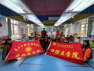 活动最后,志愿者与孩子们合影留念,鲜红的“爱心口腔”志愿服务队旗帜在教室中格外醒目。此次活动不仅让孩子们收获了护牙知识,也让志愿者们将专业所学转化为了服务实效,践行了“奉献、友爱、互助、进步”的志愿服务精神。