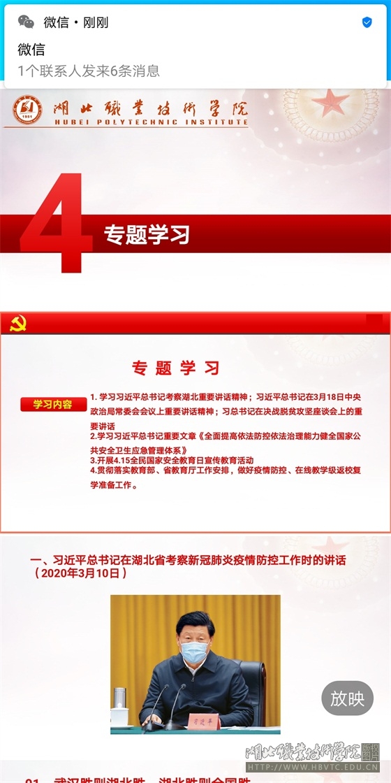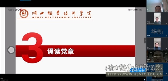 best365英国在线体育官网党总支书记廖建宏同志在讲话时从三个方面强调,一是全体党员在疫情防控特殊时期,要进一步提高政治站位,增强四个意识,不信谣、不传谣,全面加强各类平台管理;二是要进一步积极发挥各党支部的战斗堡垒作用和党员的先锋模范作用,进一步激发全体教职员把思想和行动统一到习近平总书记指示精神和学校党委的决策部署上来;三是适应工作新常态,强化各项纪律要求,坚持疫情防控和常规工作相结合,两手抓、双促进。希望全体党员同志,继续发扬湖北职院精神,严格落实各项工作职责,认真做好线上教学、专项工作推进、复学准备等工作。