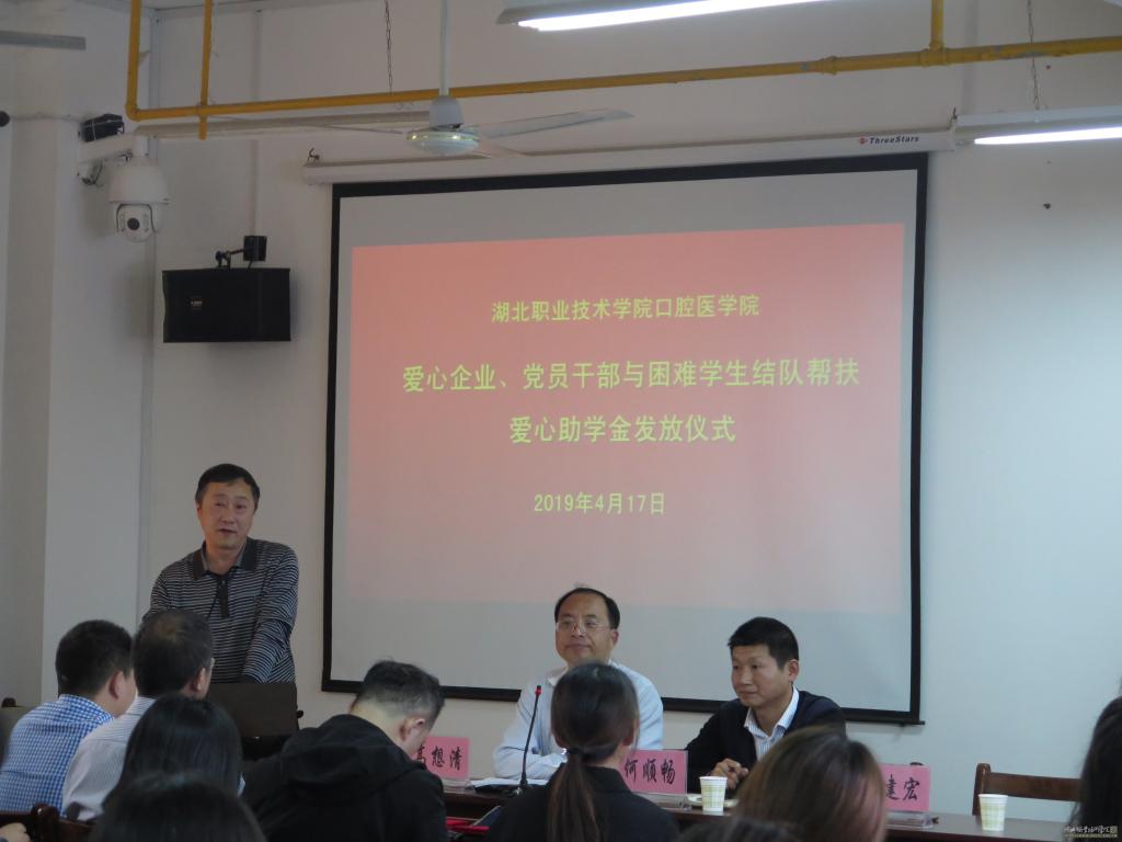 2019年4月17日下午,best365英国在线体育官网党员干部、爱心企业结对帮扶“爱心助学”助学金发放仪式在东区实验楼425会议室隆重举行。孝感市口腔医学会民营口腔专委会会长涂艮斌、学工部副部长何玉初、党委宣传部副部长何顺畅及best365英国在线体育官网党政领导、老师和受到资助的部分学生代表出席了本次活动,仪式由best365英国在线体育官网党总支副书记高想清主持。
