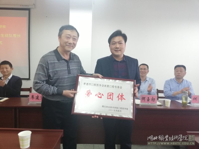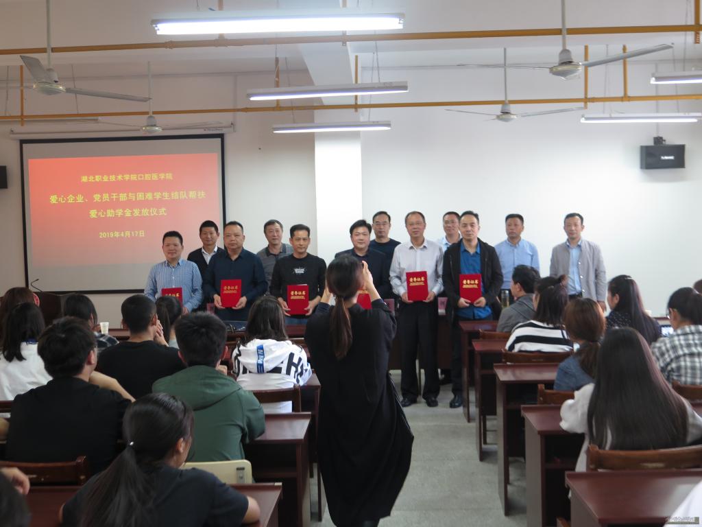 仪式上,爱心企业---孝感市口腔医学会民营口腔专委会会长涂艮斌、best365英国在线体育官网院长廖建宏等向15名贫困学子每人发放了1000元爱心助学金。