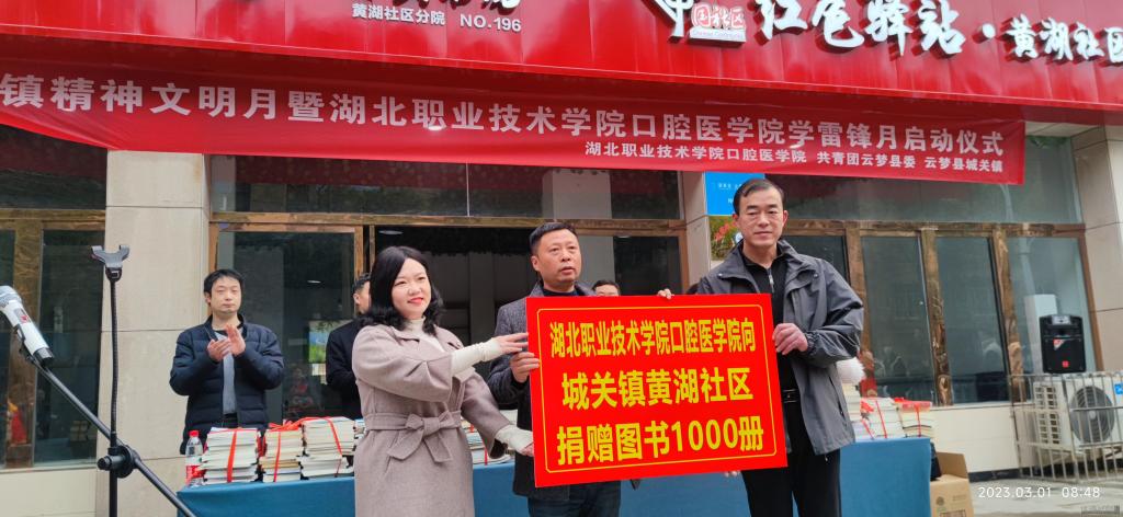 学雷锋活动月启动仪式在云梦县区黄湖社区红色驿站举行,校团委书记鲁若曦和best365英国在线体育官网何伟代表学校向黄湖社读书屋捐赠各类书籍共计1000册;